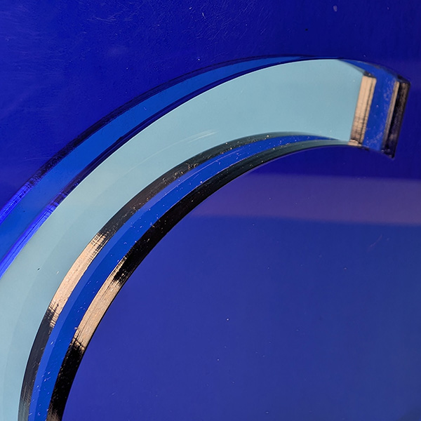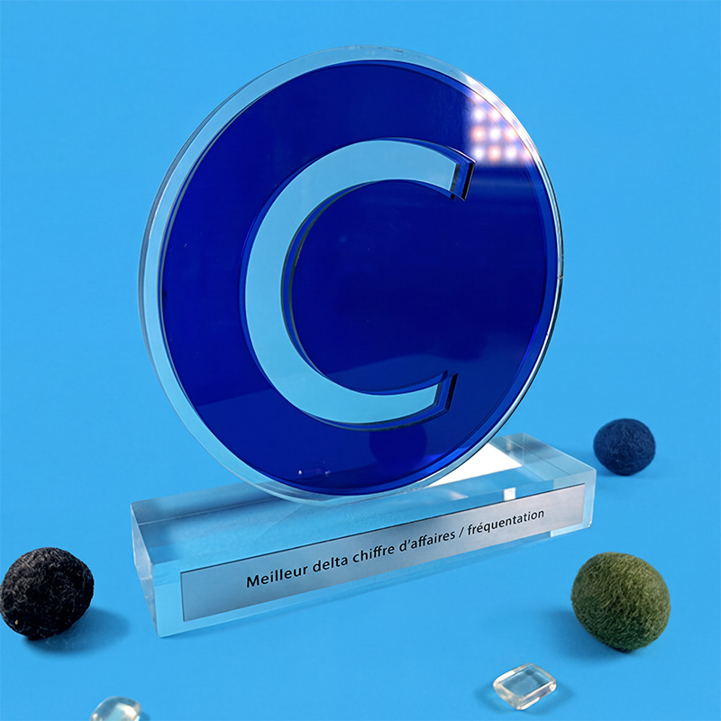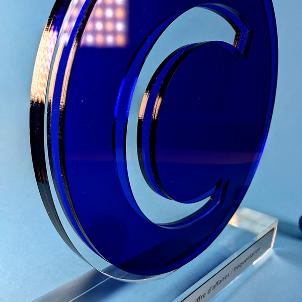 Trophée personnalisable selon un thème, un logo, une idée… Fait d’une plaque de plexi transparente prise en sandwich par deux plaques Altuglas translucides, le trophée se démarque par des effets de couches d’un rendu flatteur.