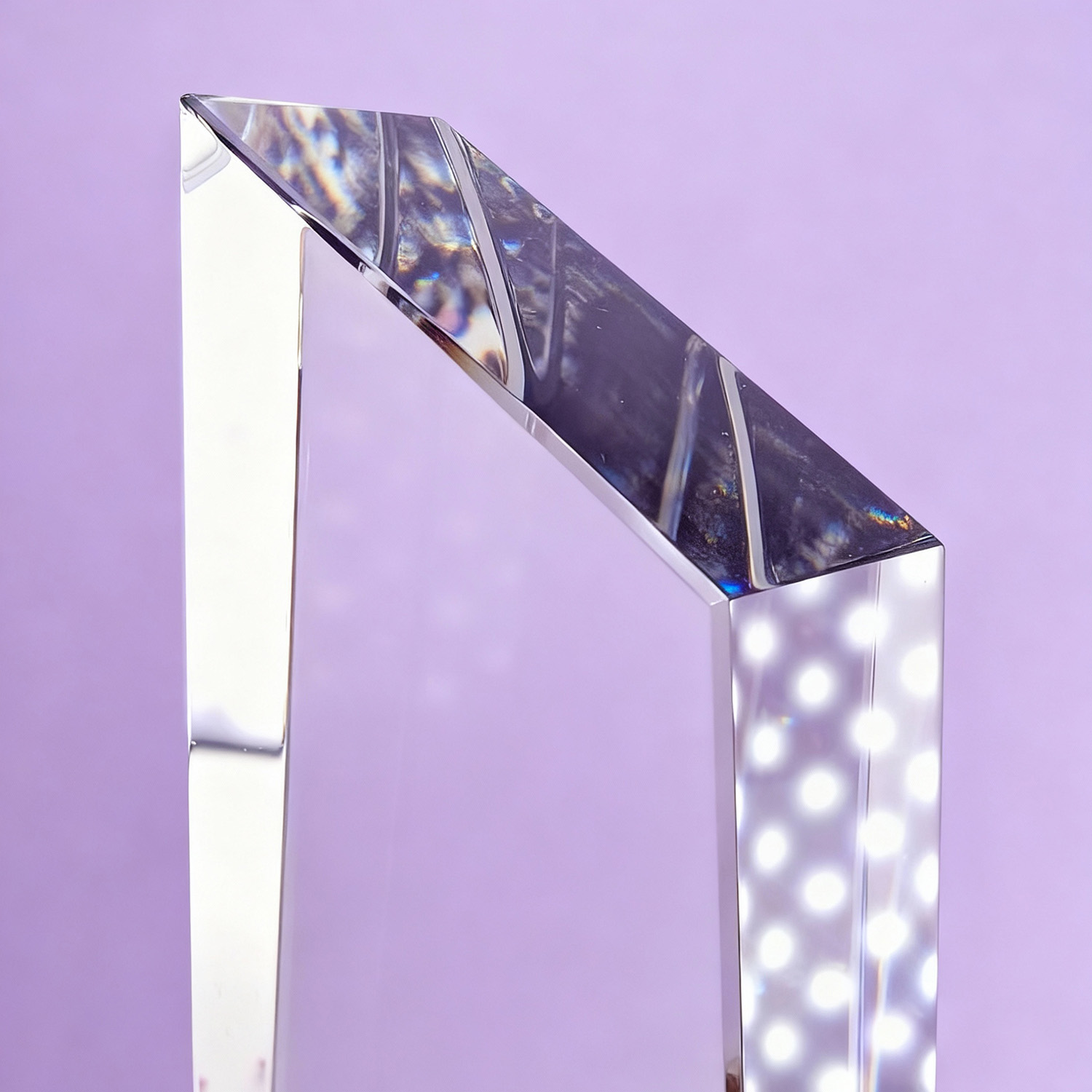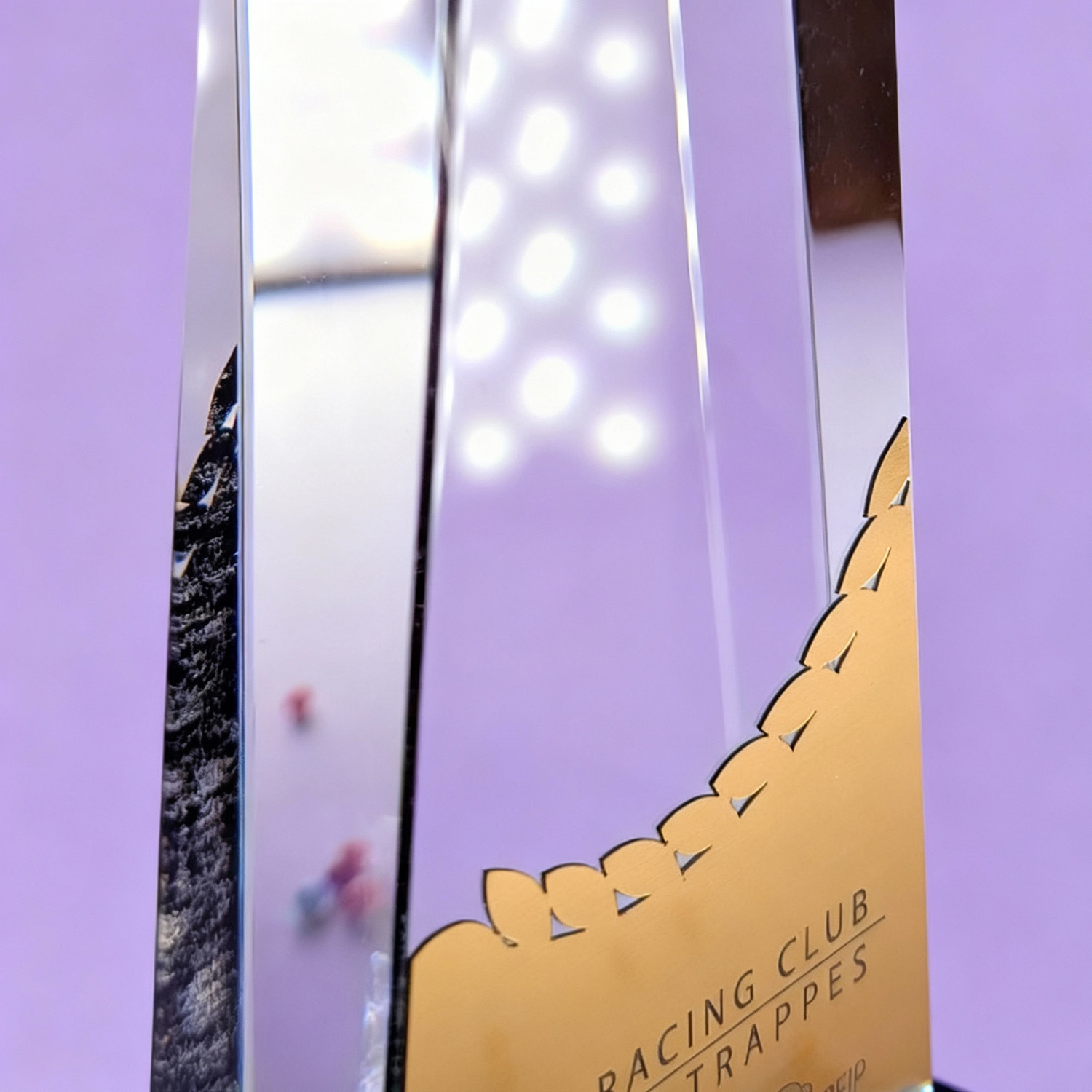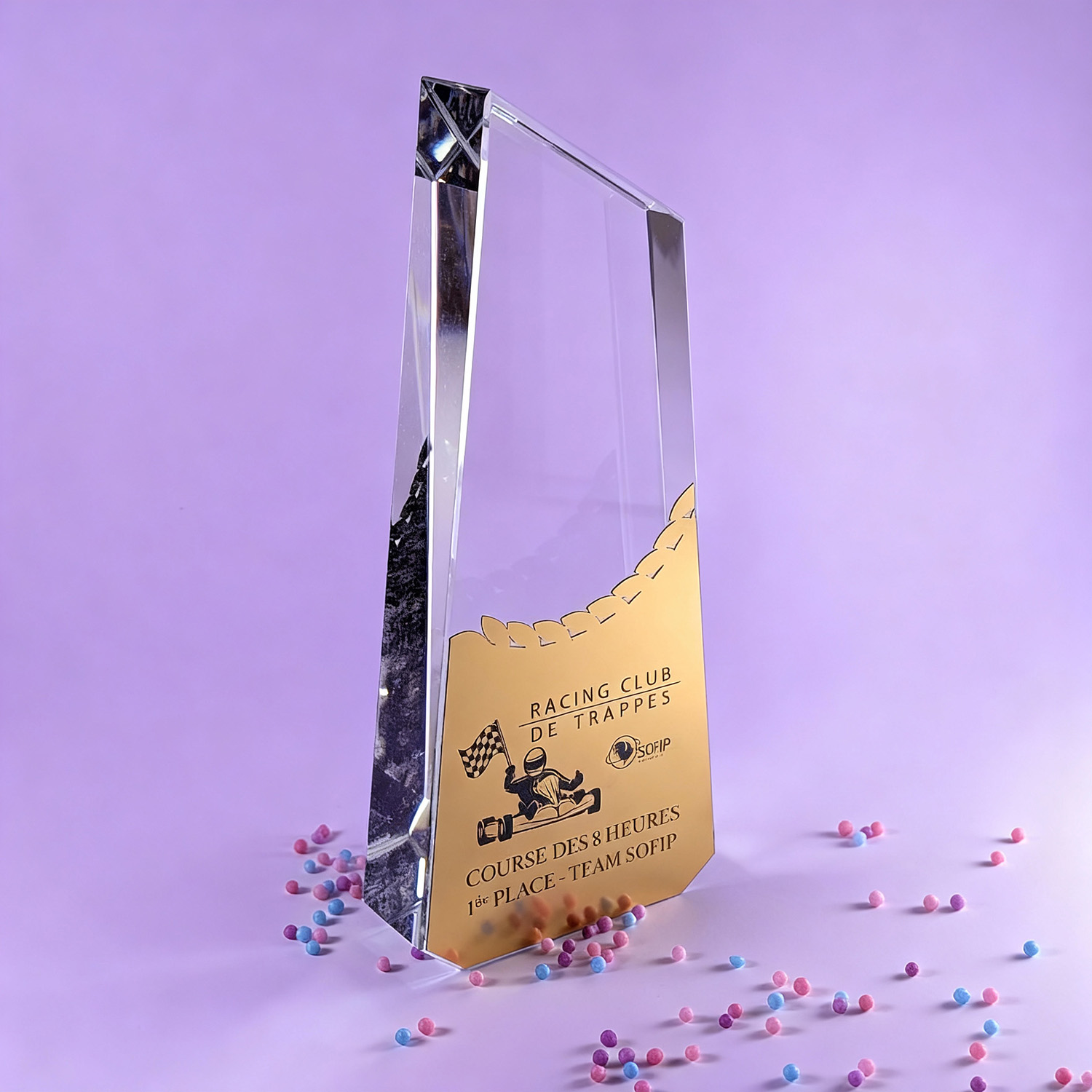 Trophée composé d’un bloc épais de verre aux angles saillants et dynamiques, assemblé à une plaque de « flex » découpée à la forme avec dessin de feuilles de laurier.
