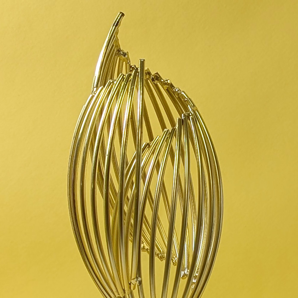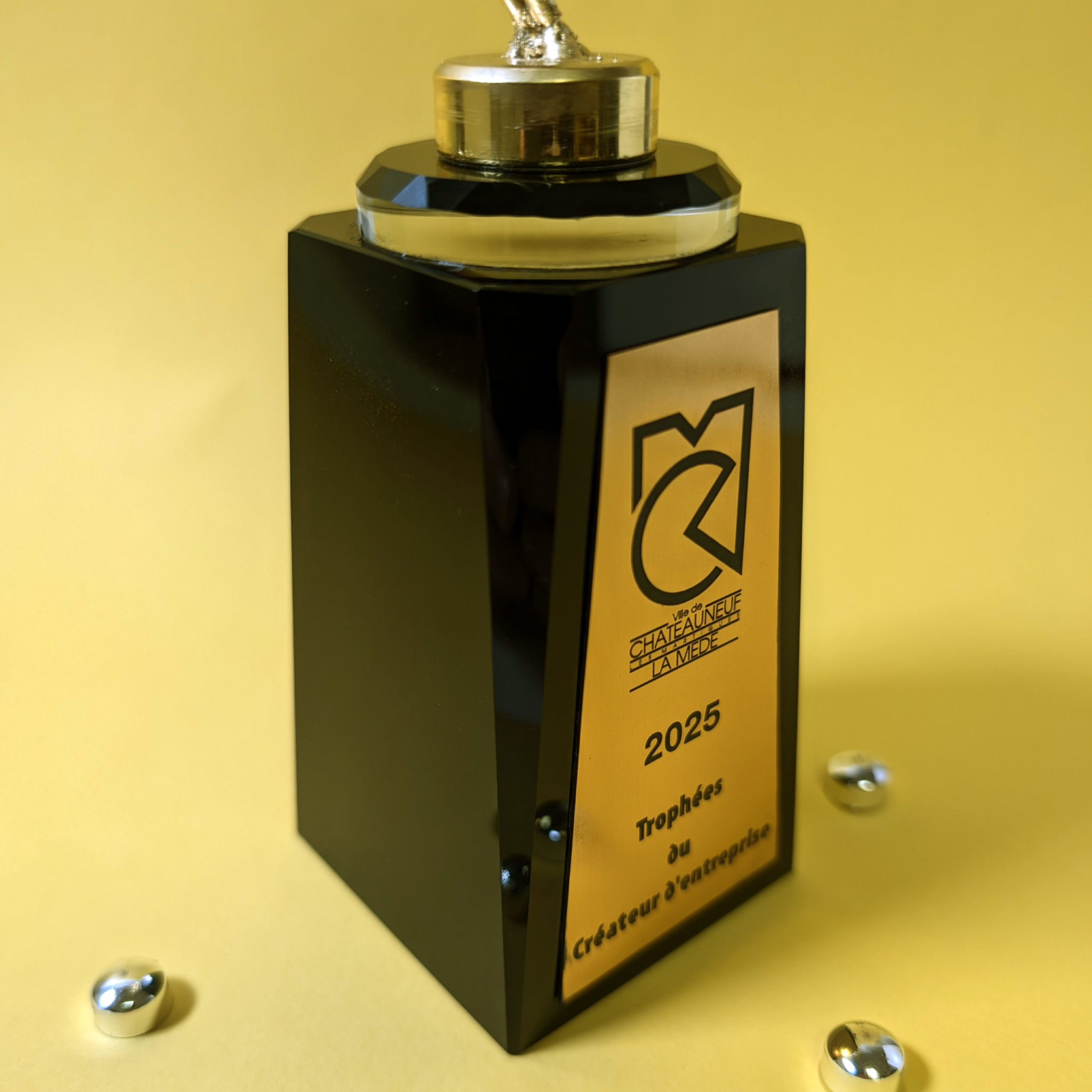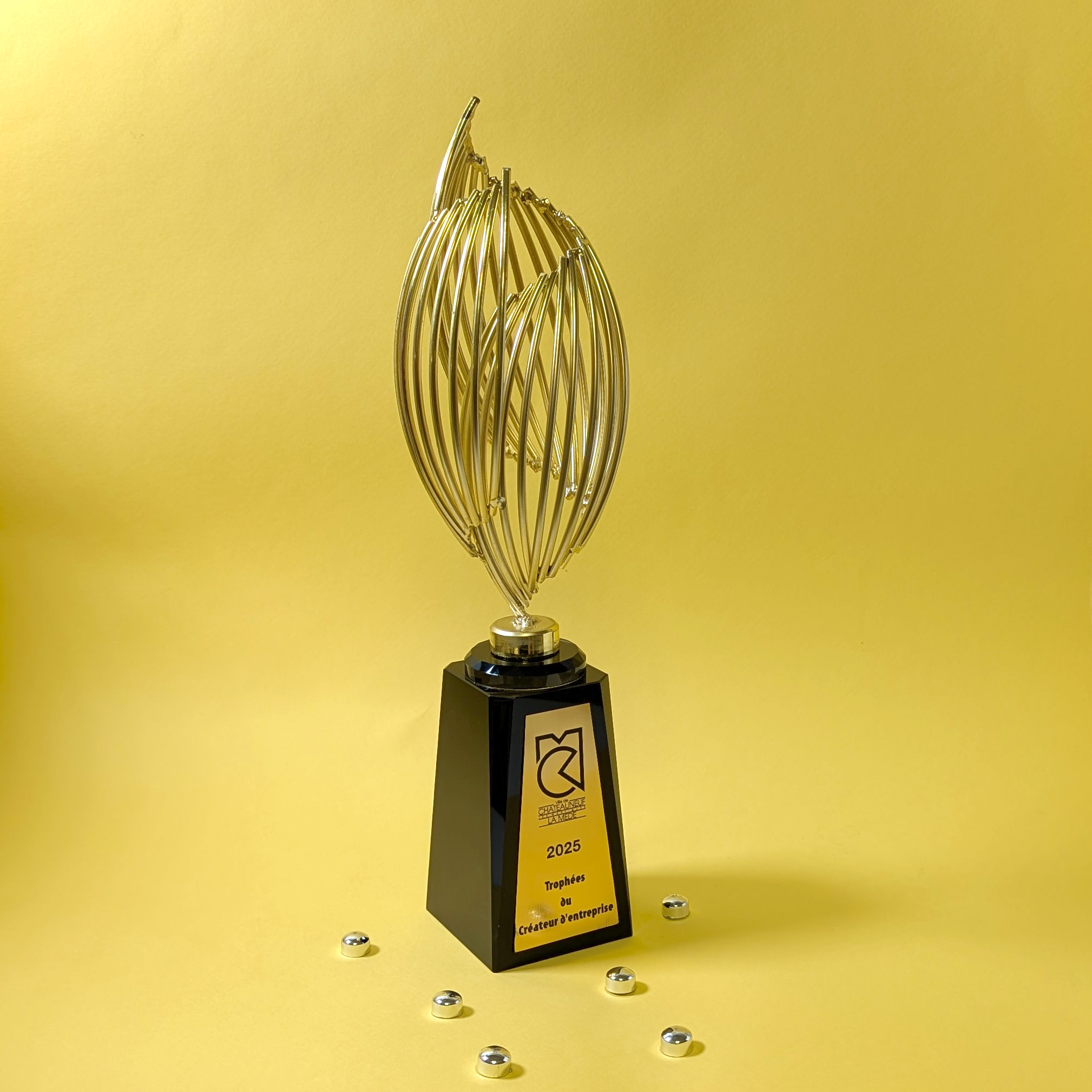 Trophée en métal composé d’une flamme abstraite dorée, reposant sur un socle en verre noir.