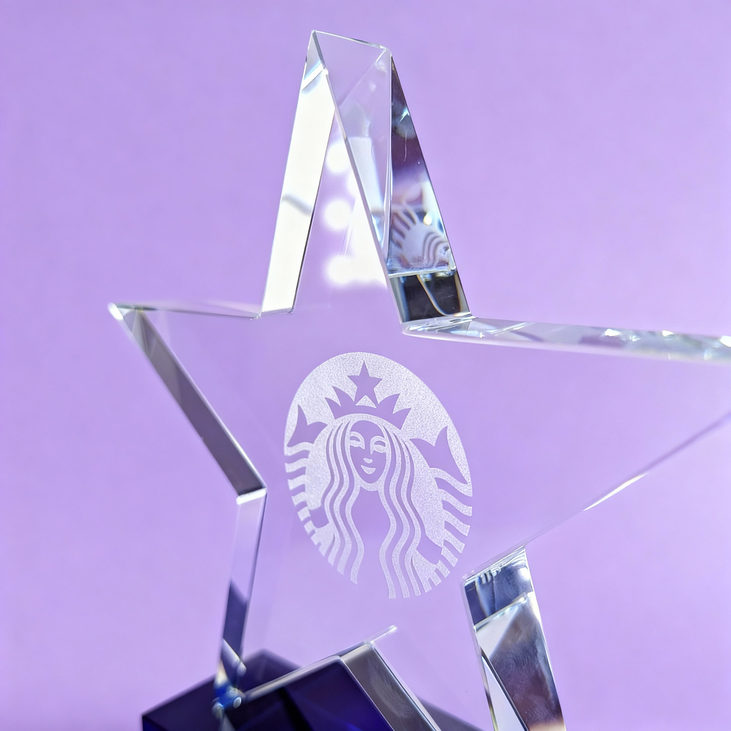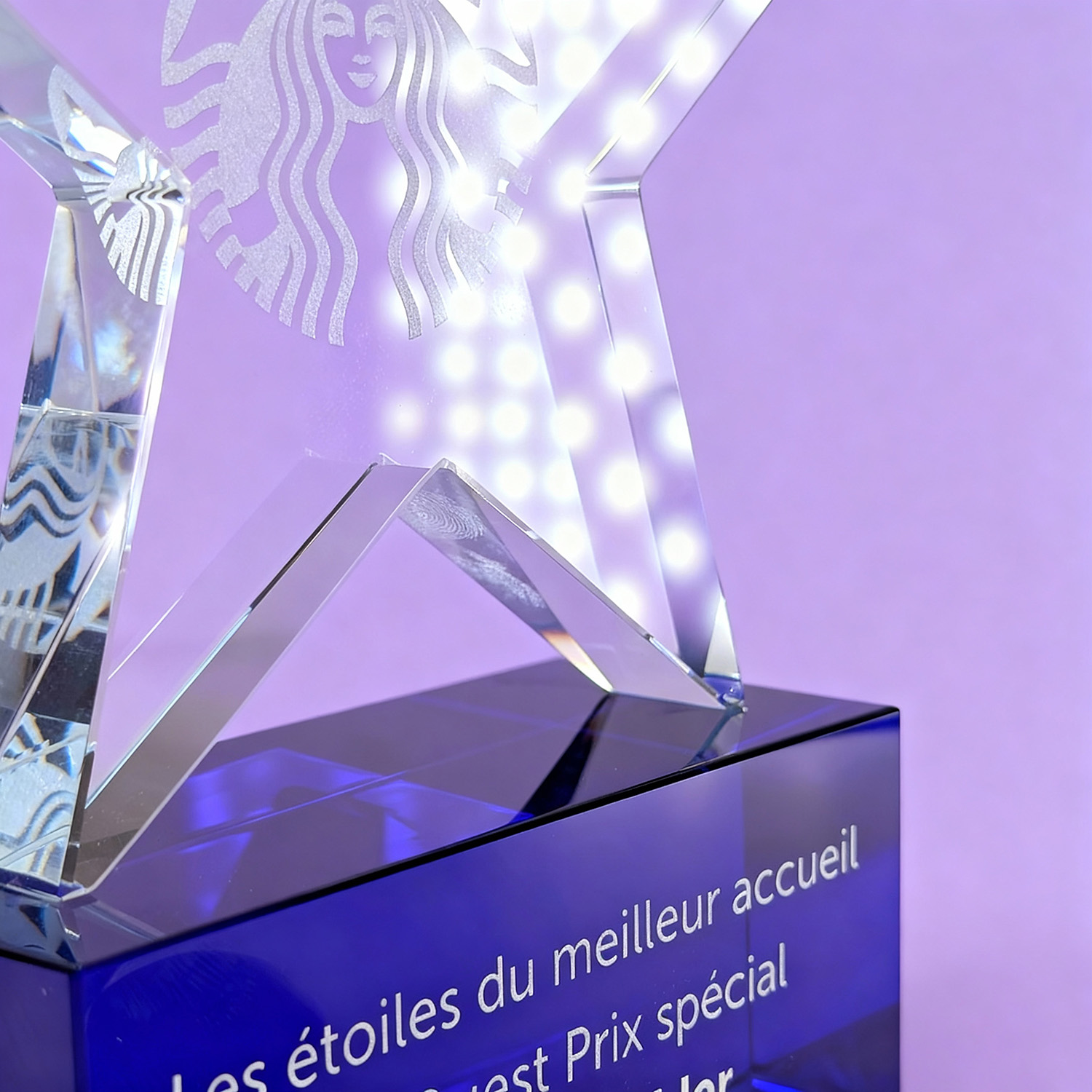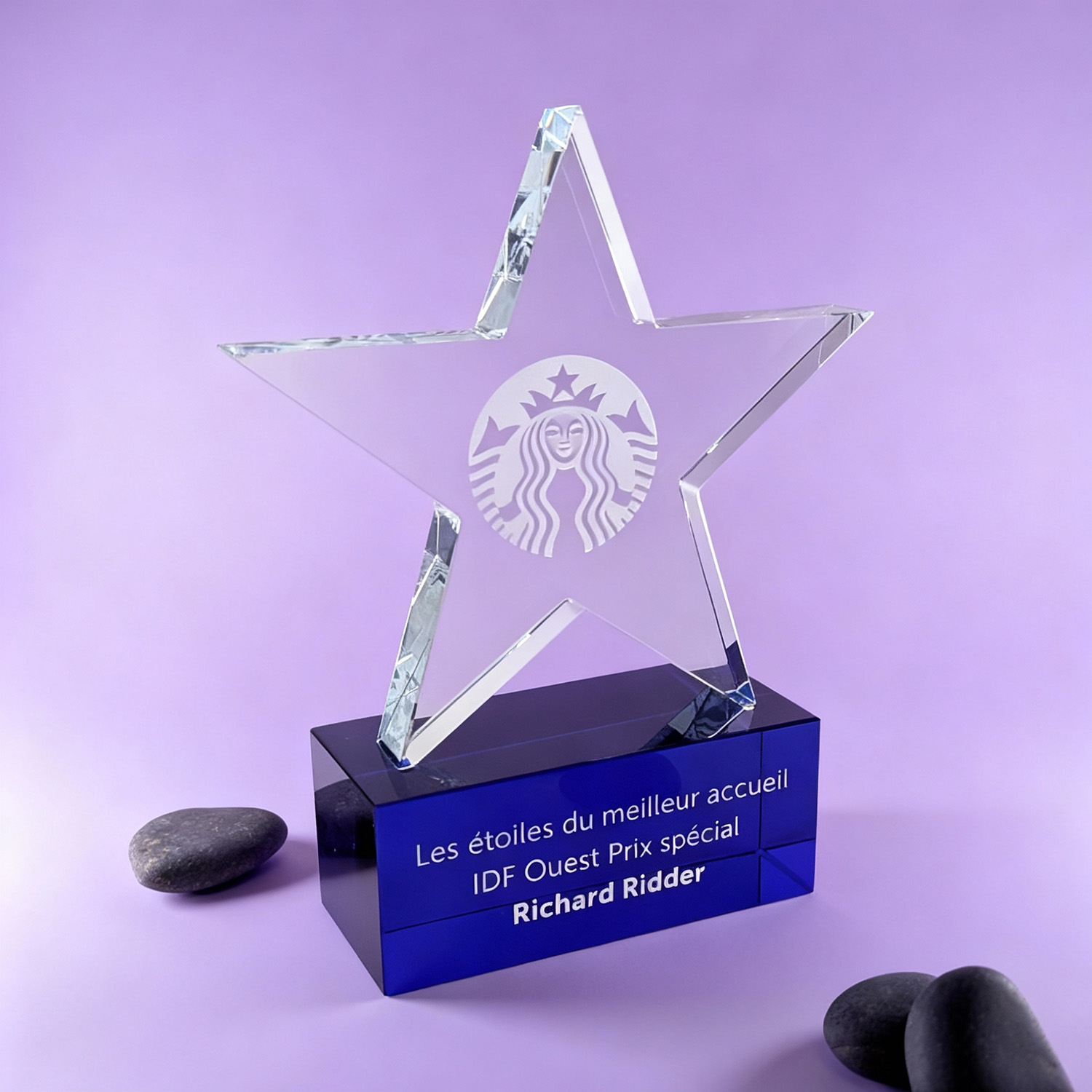 Trophée étoile en verre assemblé à un bloc en verre d’un bleu profond.
