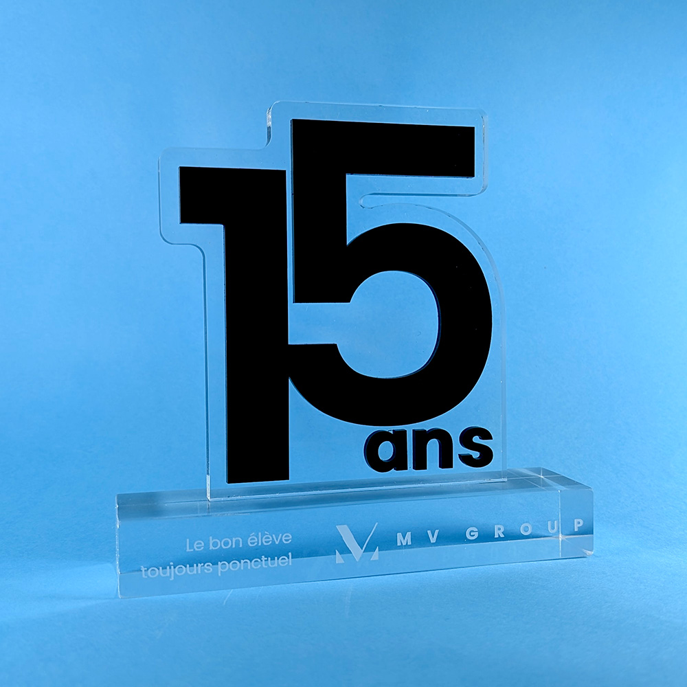 Trophée personnalisable selon un thème, un logo, une idée… Fait d’un assemblage d’une plaque de plexi transparente et d’un Altuglas opaque, le trophée se démarque par des effets de couches d’un rendu flatteur.