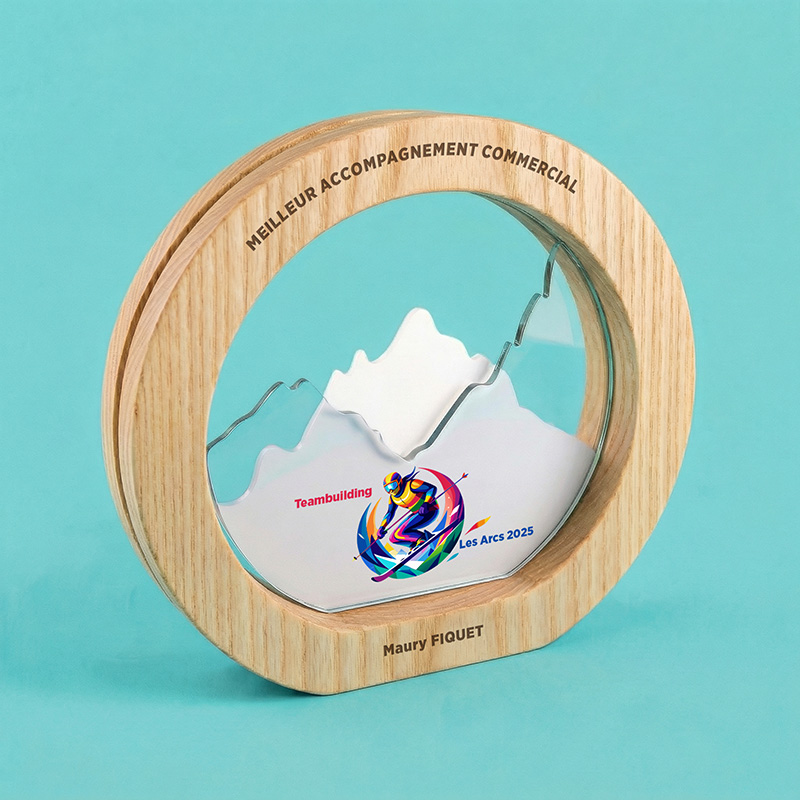 Trophée rond en bois labelisé made in France avec la personnalisation de votre choix* sur plaque de plexi. *Découpe de la plaque dans la mesure du possible.